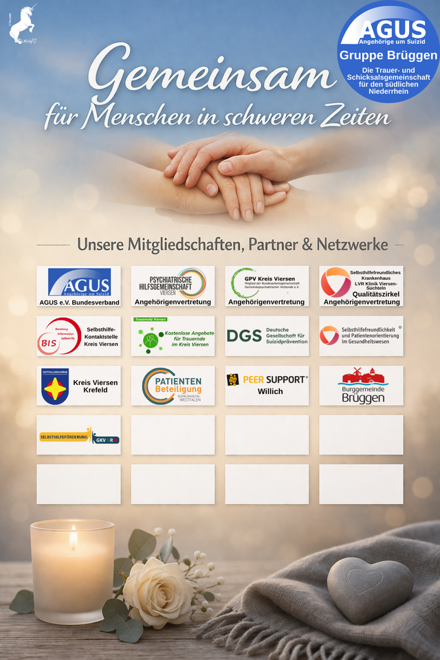 Wir von AGUS Brüggen glauben daran, dass Veränderung nur gemeinsam gelingt – und dass die Perspektive von Angehörigen nach einem Suizid in Netzwerken, Kliniken, Selbsthilfestrukturen und in der Gesellschaft eine hörbare Stimme braucht.